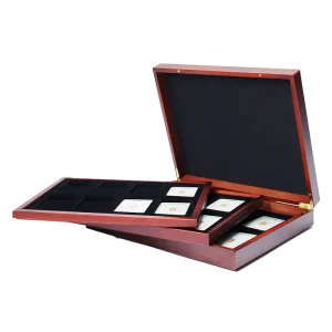 Op zoek naar een stijlvolle manier om je ingekapselde munten te presenteren? Ontdek onze prachtige muntdozen met een zijdezachte bekleding en een inlay van zwart fluweel. Binnenin de deksel vind je een satijnen lint waar je desgewenst een persoonlijke boodschap aan kunt bevestigen. De stevige metalen frame beschermt de munt en is geschikt voor capsules met een binnendiameter van 38 mm. Productnummer: P0296* Afbeeldingen zijn ter illustratie en producten kunnen licht afwijken. Laat een review achter en deel jouw ervaring!